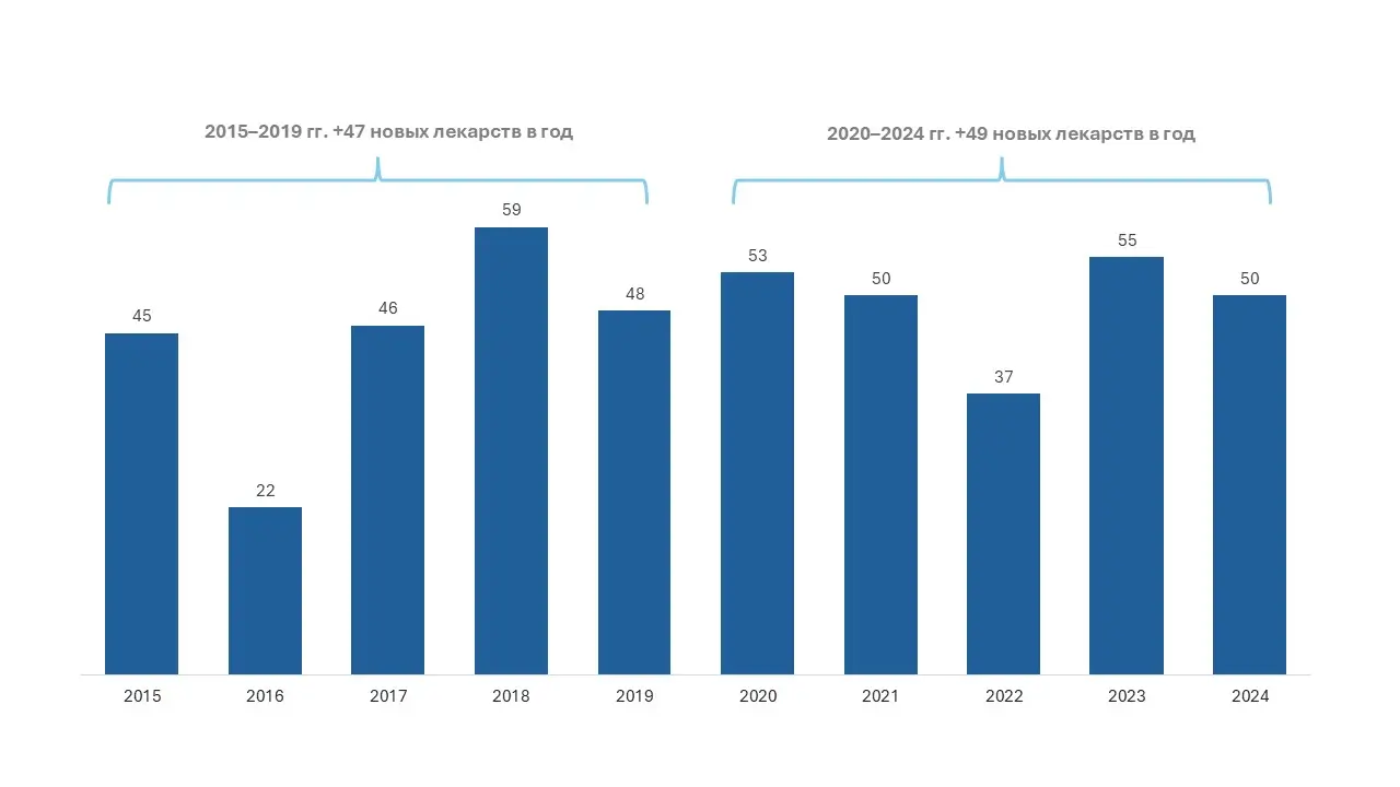 Представленный ниже 10-летний график показывает, что с 2015 по 2024 г. CDER в среднем ежегодно одобрял около 47 новых лекарственных средств, при этом за последние 5 лет средний показатель составляет 49 препаратов.