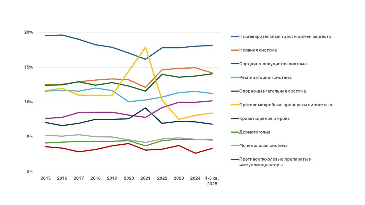 В терапевтическом разрезе (в соответствии с АТС-классификацией I уровня) пятерку лидеров формируют лекарственные средства, влияющие на пищеварительную систему и метаболизм, нервную систему, сердечно-сосудистую систему, респираторную систему, опорно-двигательный аппарат (рис. 10). Фиксируется увеличение доли заболеваний нервной, сердечно-сосудистой систем и опорно-двигательного аппарата с начала полномасштабного вторжения РФ в Украину с 2022 г.