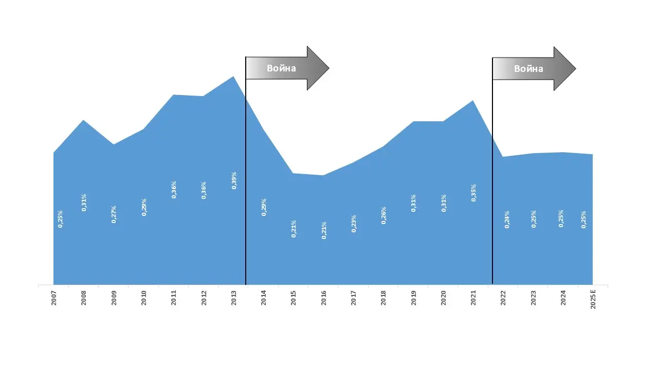 Рис. 9. Динамика доли украинского фармрынка в глобальном объеме потребления лекарств за 2007–2025 гг., %